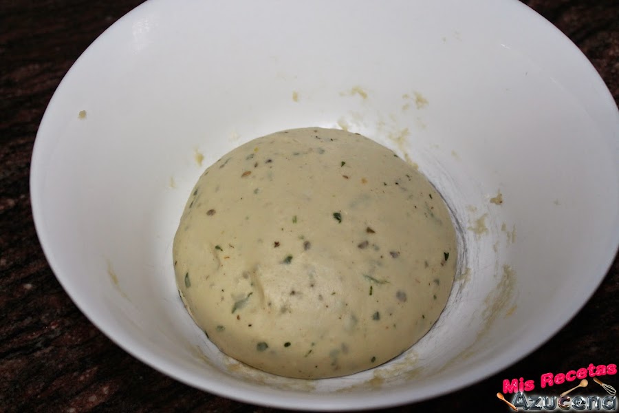Transcurrido el tiempo de fermentación sacaremos la masa y la pondremos sobre la barra de la cocina para volverla a amasar pero esta vez no pondremos harina, pondremos un chorreón de aceite de oliva, amasaremos unos 5 minutos.
