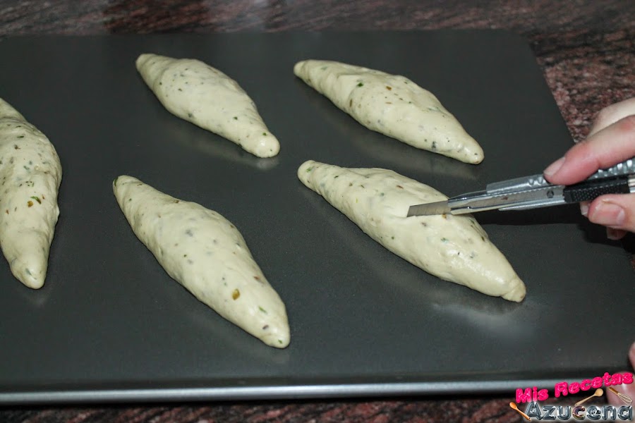 Pasado el tiempo de fermentación por los panecillos justo antes de meterlos en el horno le haremos unos cortes transversales con ayuda de un cúter, abrimos el horno pulverizamos con agua las paredes del horno y metemos la bandeja con los panecillos.