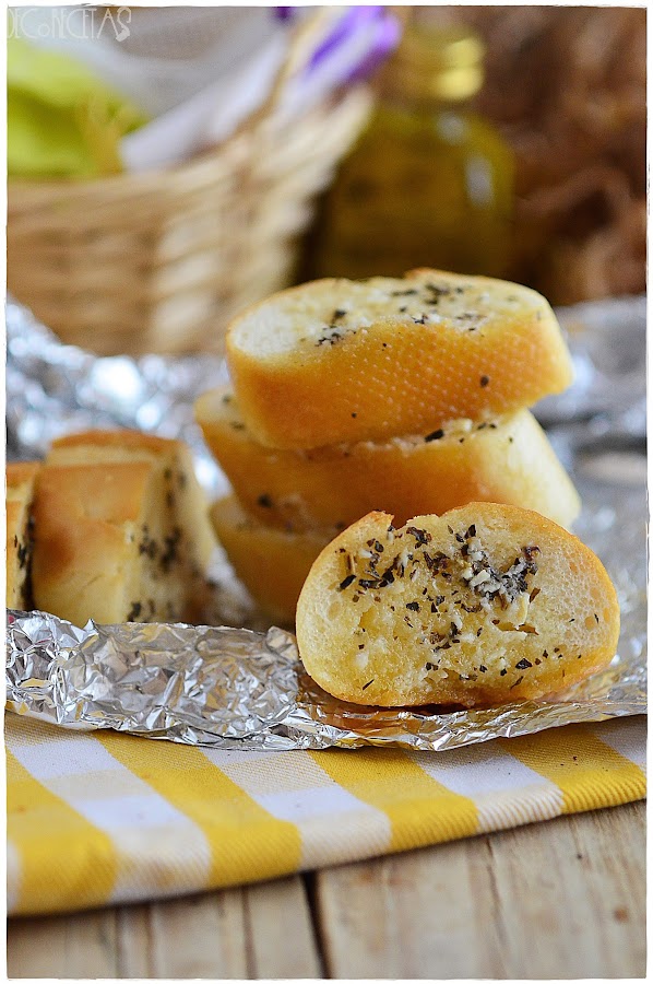Rallamos 4 dientes de ajo y mezclamos con 200gr de mantequilla a temperatura ambiente, sal y pimienta al gusto, un puñadico de perejil y otro de albahaca bien picados. Esta mezcla la esparcimos dentro de una baguette de pan en la que hicimos unos cortes en diagonal a lo ancho de toda ella sin que lleguen al final. Encendemos el horno a 200º y mientras, envolvemos el pan con papel albal e introducimos en el horno por 15 minutos.