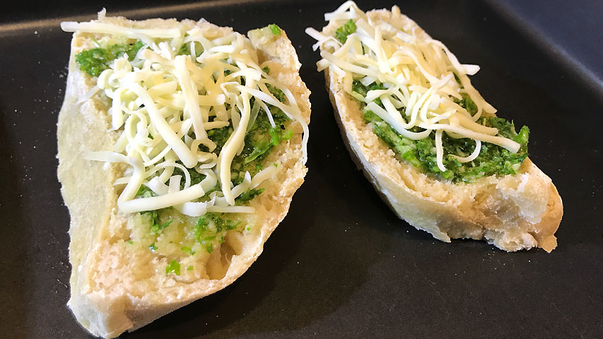 Unta el pan con el majado, cubre con un queso que te guste y al horno que debe estar a máxima potencia. Si tienes gratinador, con gratinador.