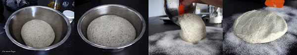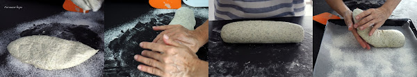 Una vez amasada convenientemente retirar del vaso mezclador y formar una bola. Aceitar un bol y poner la masa a hacer el primer levado, tapada con un trapo limpio o con film transparente. Dejar reposar entre hora y hora y media, dependiendo de la temperatura de la habitación. Cuando haya aumentado el volumen, volcar la masa sobre la encimera ligeramente enharinada y desgasar. Formar ahora las piezas que queramos, en nuestro caso dos barras.