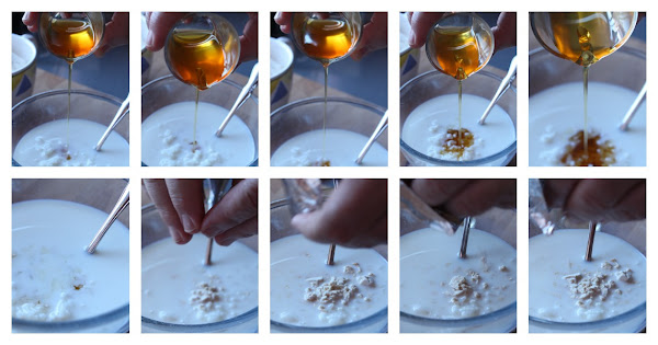 Mezclamos en una jarra o un bol el arroz, la leche la levadura y la miel.