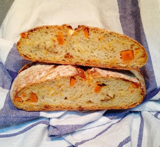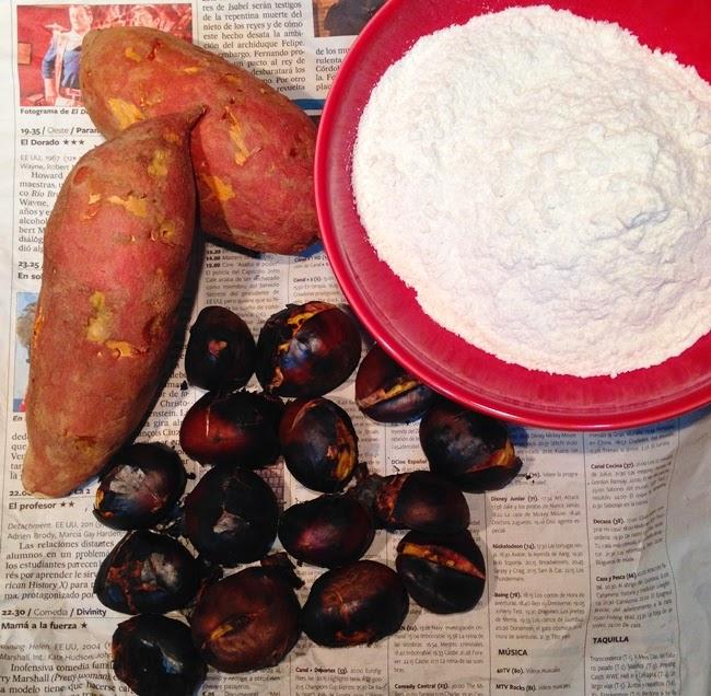 Aprovechando ingredientes del tiempo me he animado a preparar este pan que lleva boniato y unas castañas,