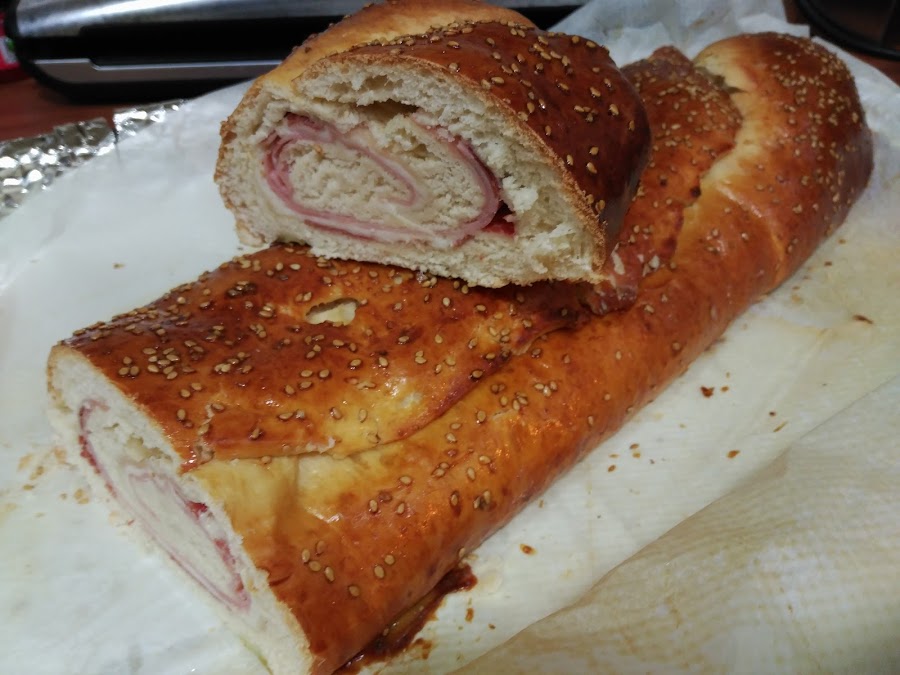 - Enrollar como un brazo de gitano, sellar el borde final (con agua o con los dedos, aplastando) y remeter los extremos de la masa por debajo del brazo.