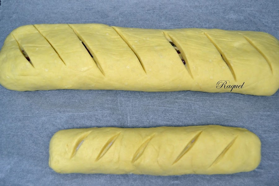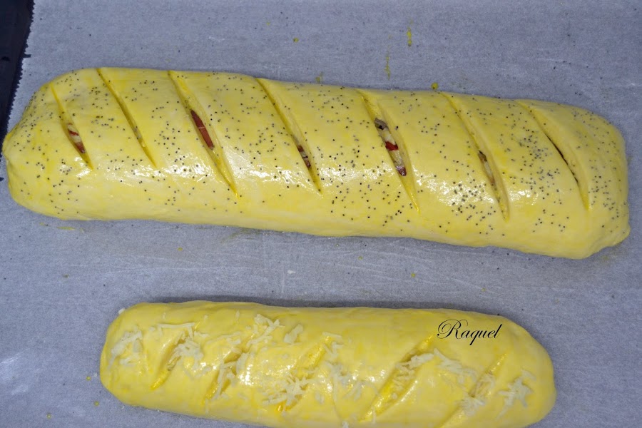 Batimos un huevo y pintamos los panes, al mio le eche unas semillas de amapola y al de mi hija queso rallado por encima.