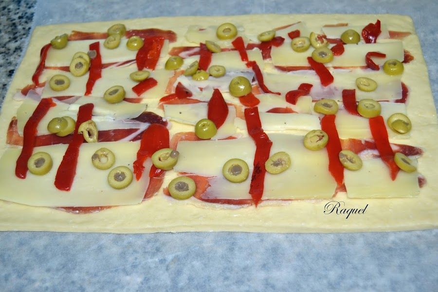 Cortamos las aceitunas a rodajas y las repartimos por encima y por ultimo ponemos las tiras de pimiento.