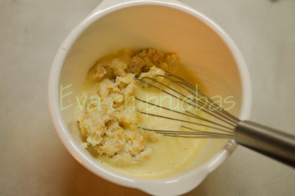 Volvemos al pan, comprobamos que se está empapando bien y volvemos a machacar con el tenedor, procurando que todo se empape, incluido la corteza.