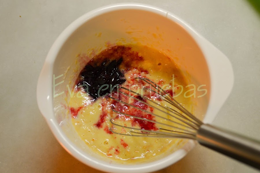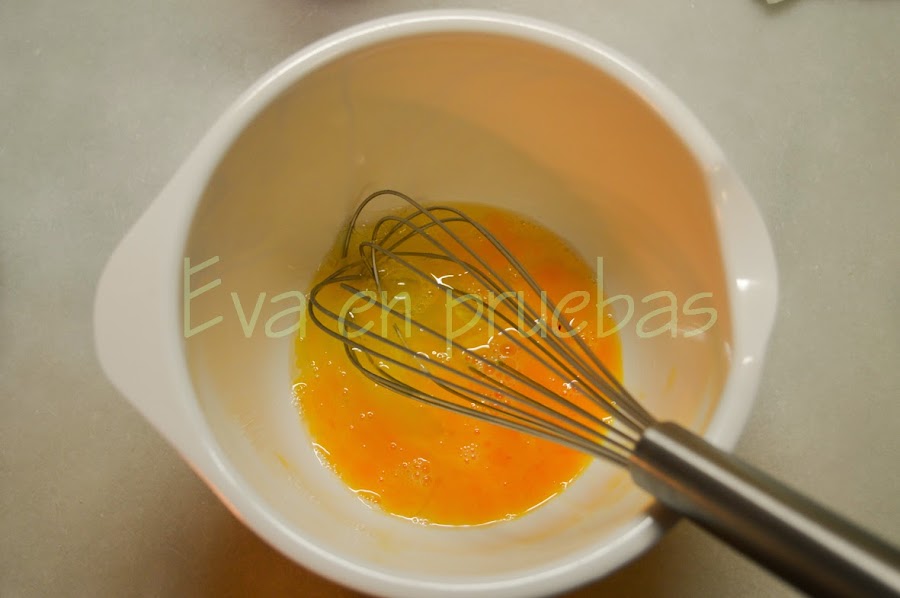 En un cuenco ponemos los huevos, los batimos a mano como para tortilla, añadimos el pan y volvemos a batir con la batidora, añadimos las cerezas y mezclamos a mano todo junto y dejamos reposar.