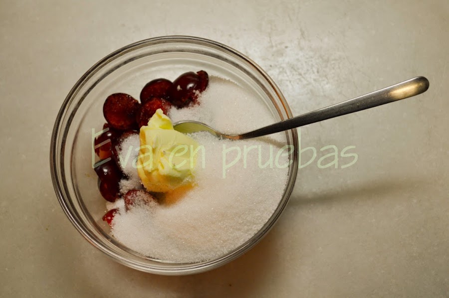 En un vaso batidor introducimos las cerezas, el azúcar y la margarina. Introducimos la batidora, lo trituramos a groso modo y dejamos macerar.