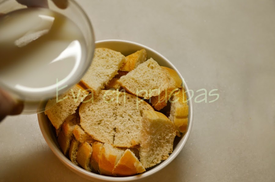 Troceamos el pan, lo ponemos en un cuenco o plato hondo y añadimos la leche empapando el pan al máximo. De tanto en tanto con ayuda de un tenedor vamos machando el pan, procurando que todo el pan quede bien empapado.