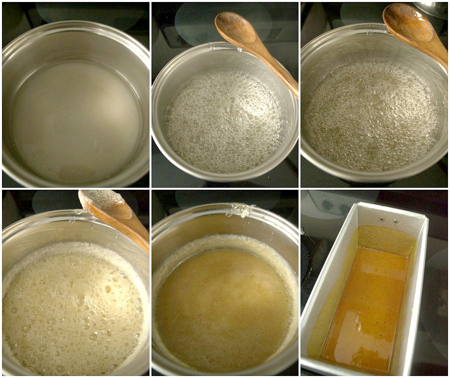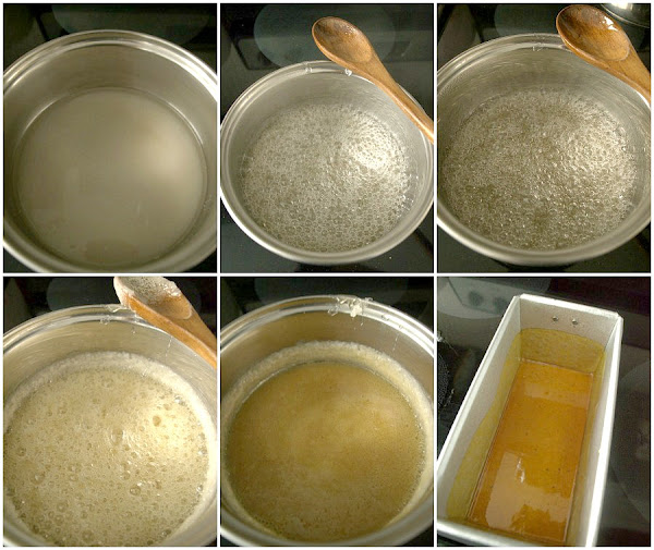 Remove fron the heat and CAREFULLY (IT IS REALLY HOT), pour caramel into the mold (10x20 cm) chosen.