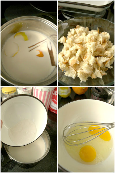 In a saucepan, place milk, orange and lemon zests, and cinnamon stick, andbring to boil.