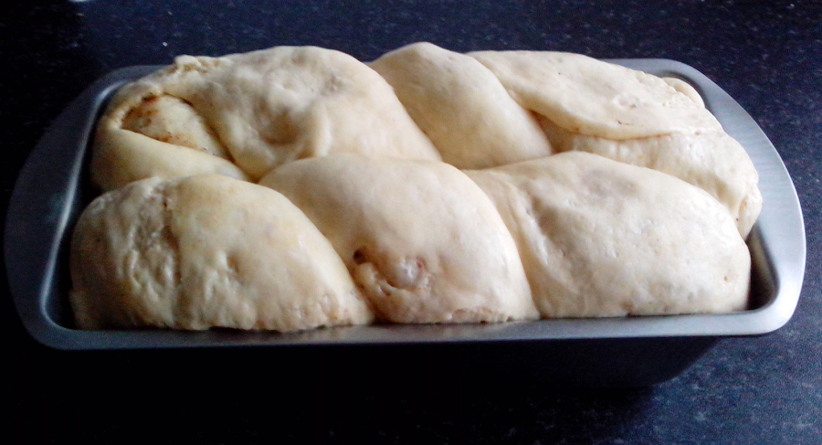 -Colocamos esta masa retorcida en un molde de pan engrasado, y repetimos este procedimiento con la otra media. Una vez tengamos las dos mitades en el molde, volvemos a taparlo con film transparente y lo dejamos reposar una hora.