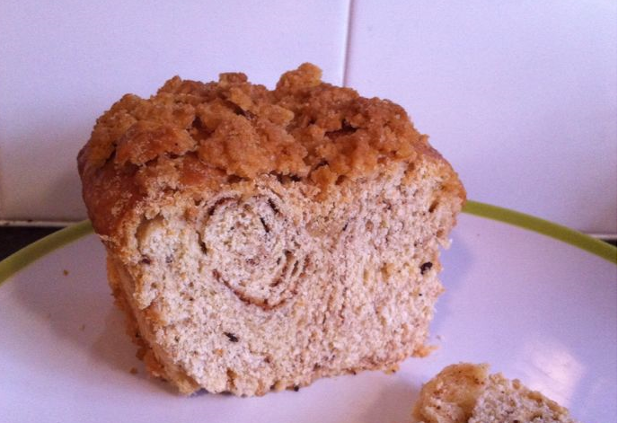 -Si queréis que la cobertura se quede bien pegada al pan, poner un poco de mantequilla derretida antes de espolvorearla sobre la masa, así evitaremos que al cortarlo se desmigaje, como pasó en mi caso.