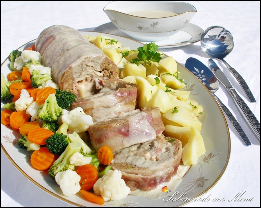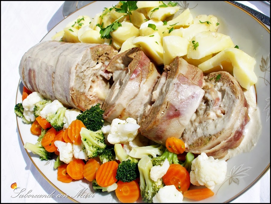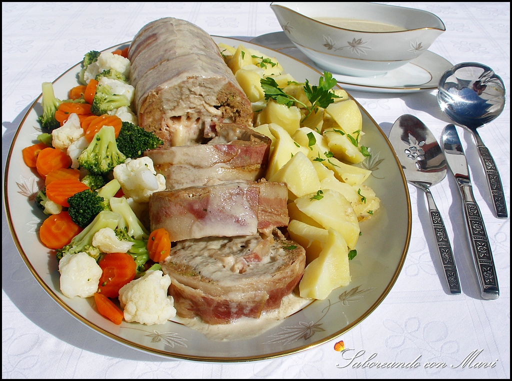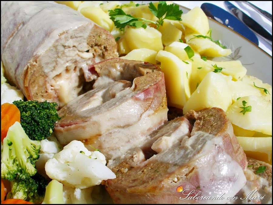 Coloque las lonchas de jamón sobre la carne y las lonchas de queso sobre el jamón, enrolle todo junto como si fuera un brazo de gitano y selle con los extremos apretando muy bien.