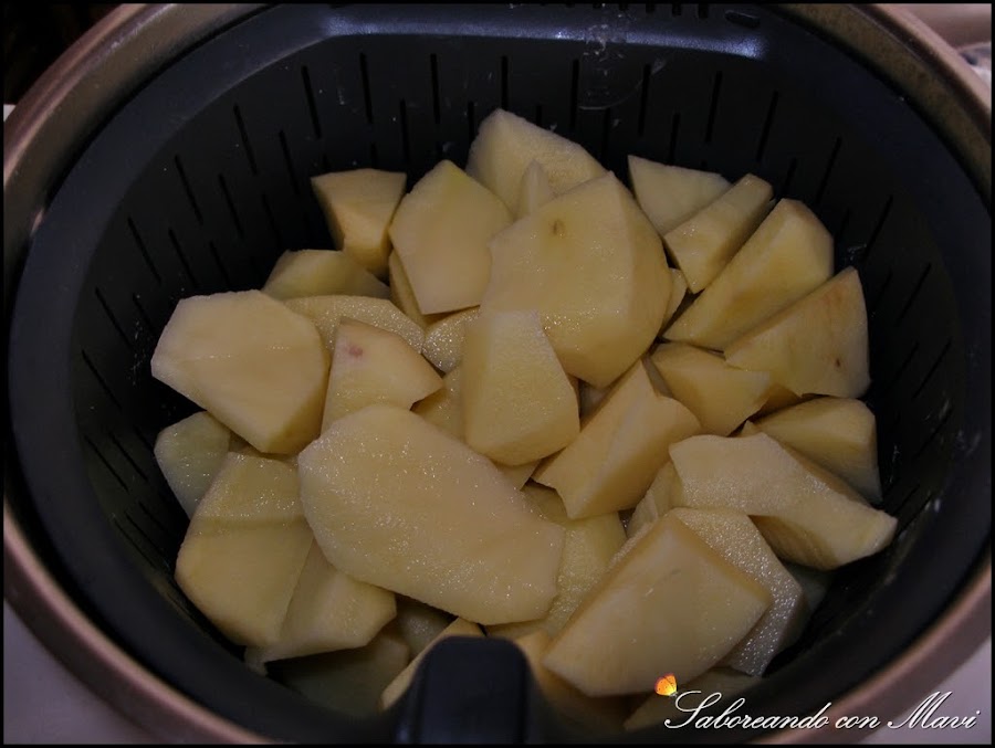 9- Retire el recipiente varoma. Utilice la muesca de la espátula para extraer el cestillo, añada la nata (crema de leche) al vaso y programe 1 min/100º/ vel 1.de carne y corte en lonchas. Sírvalas en una fuente junto con la salsa y las verduras espolvoreadas con sal.
