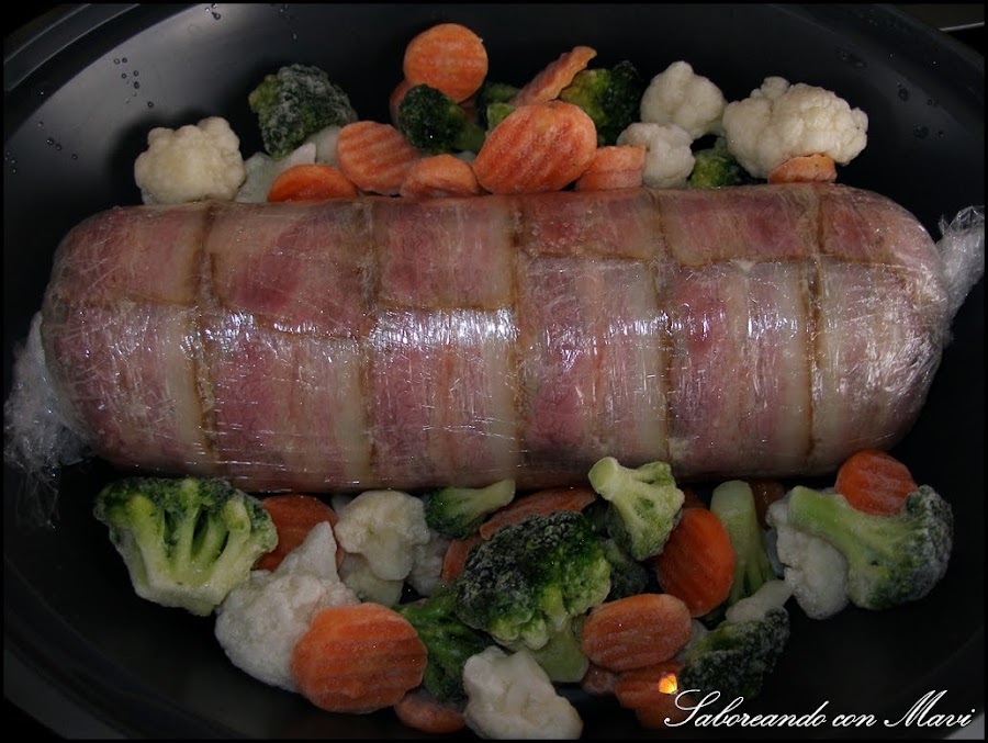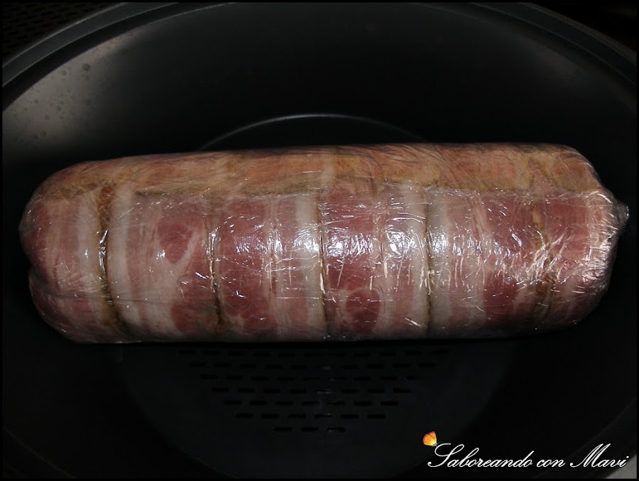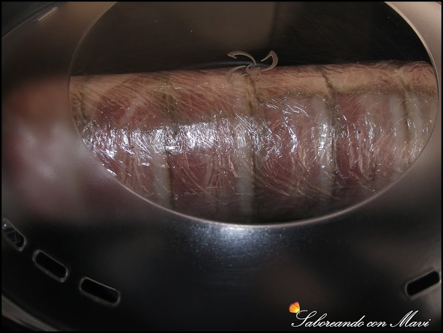 Ponga el rollo de pan de carne en el recipiente varoma y con una brocheta perfore el films transparente varias veces. Tape el recipiente varoma y reserve.