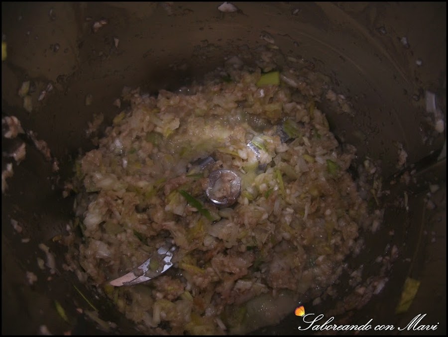 5- Ponga en el vaso el puerro, el ajo y os champiñones y prog. 3seg/vel5. Con la espátula baje los restos de verduras de la tapa y del interior del vaso hacia las cuchillas y reserve.