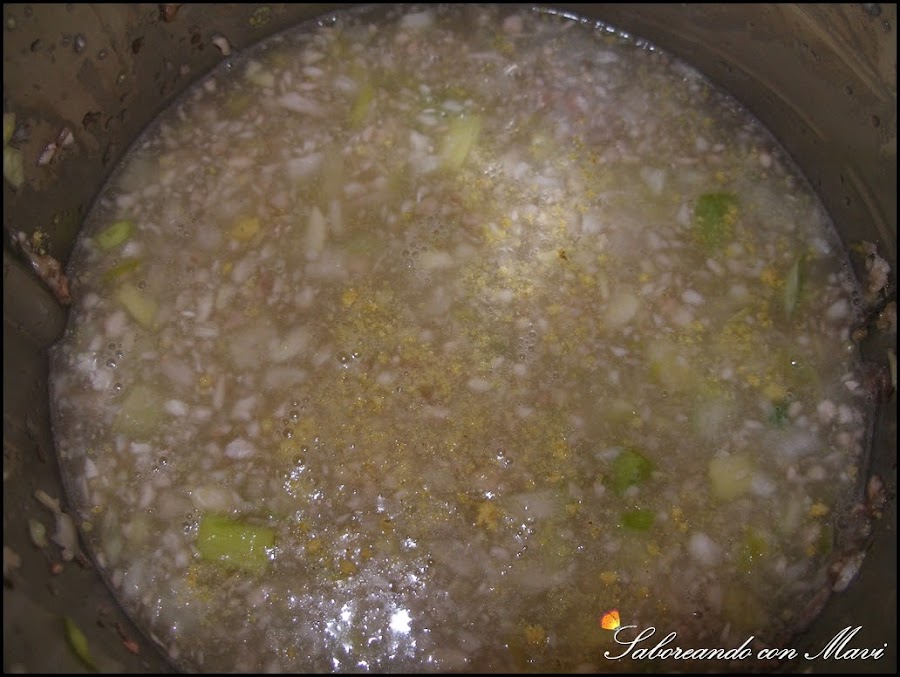7- Incorpore el vino, el agua y la pastilla de caldo. Sitúe el recipiente varoma en su posición y programe 25 min/varoma vel. 1.