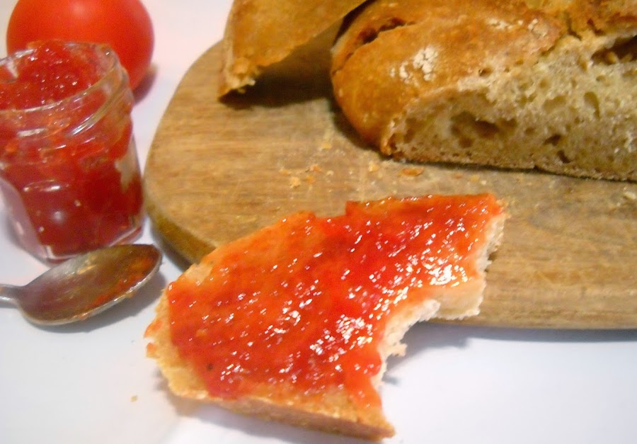 Vuelvo a poneros el enlace de la receta de la mermelada de tomate y del pan casero con masa madre recordad que al pan casero le he añadido cebolla caramelizada.