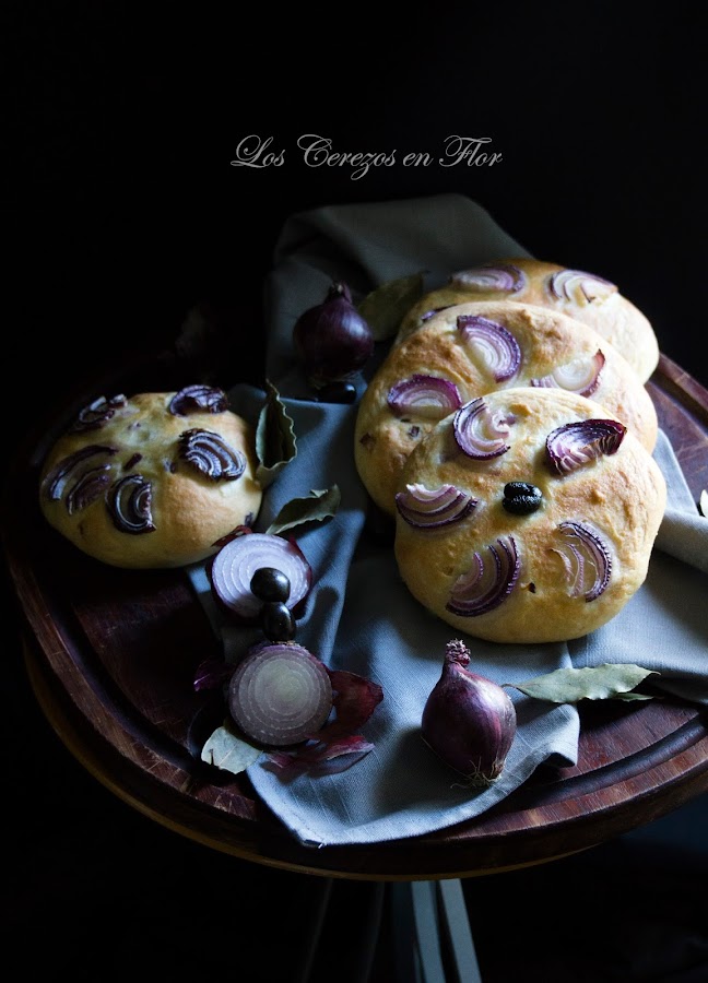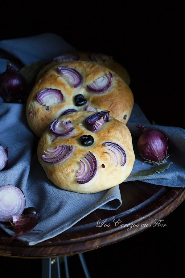 4. Una vez transcurrido el tiempo, volcar la masa sobre la superficie de trabajo ligeramente aceitada e integrar la cebolla finamente picada. Seguidamente dividirla en 4 porciones iguales. Formar una bola con cada una de ellas. Ir aplastando amorosamente con la palma de la mano hasta crear una oblea redondeada. Ir acomodando las medias lunas de cebolla todas orientadas hacia el mismo lugar y en el centro una oliva negra. Dejar levar 20 minutos. Hornear a 190°C durante 20-25 minutos.