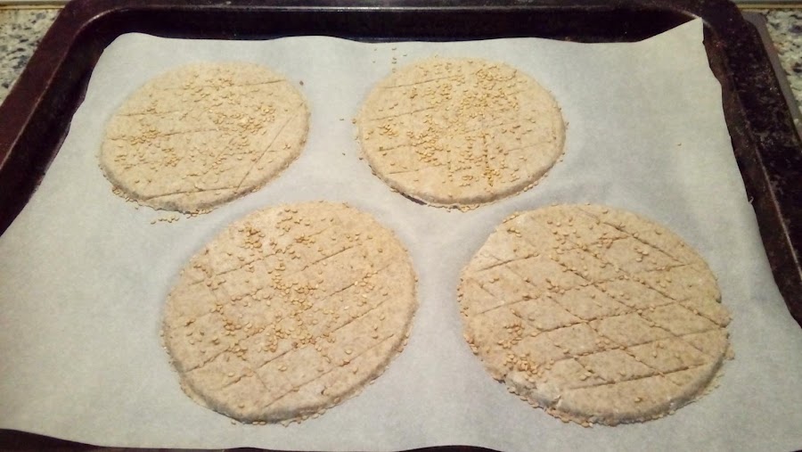 Las ponemos en una bandeja de horno y le espolvoreamos con sésamo.