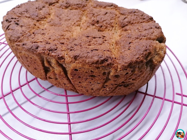 2.-Precalenytamos el horno a 180ºC, cocemos el pan de centeno integral 35 minutos hasta que esté dorado por fuera y hecho por dentro. Retiramos el pan del horno, dejamos que se temple unos minutos. Retiramos el pan de centeno del molde, dejamos que se enfríe sobre una rejilla.