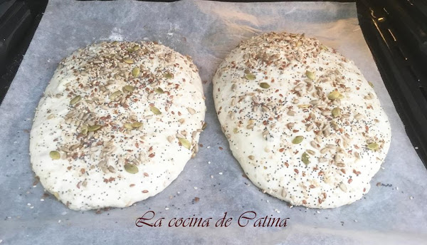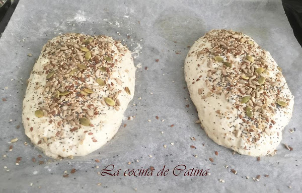 Con una brocha pintamos los panes con agua y echamos por encima las semillas reservadas. Los colocamos sobre una bandeja de horno cubierta con papel sulfurizado, los cubrimos con un paño de cocina y los dejamos reposar en un lugar resguardado del aire unos 40 minutos, hasta que doblen su tamaño.