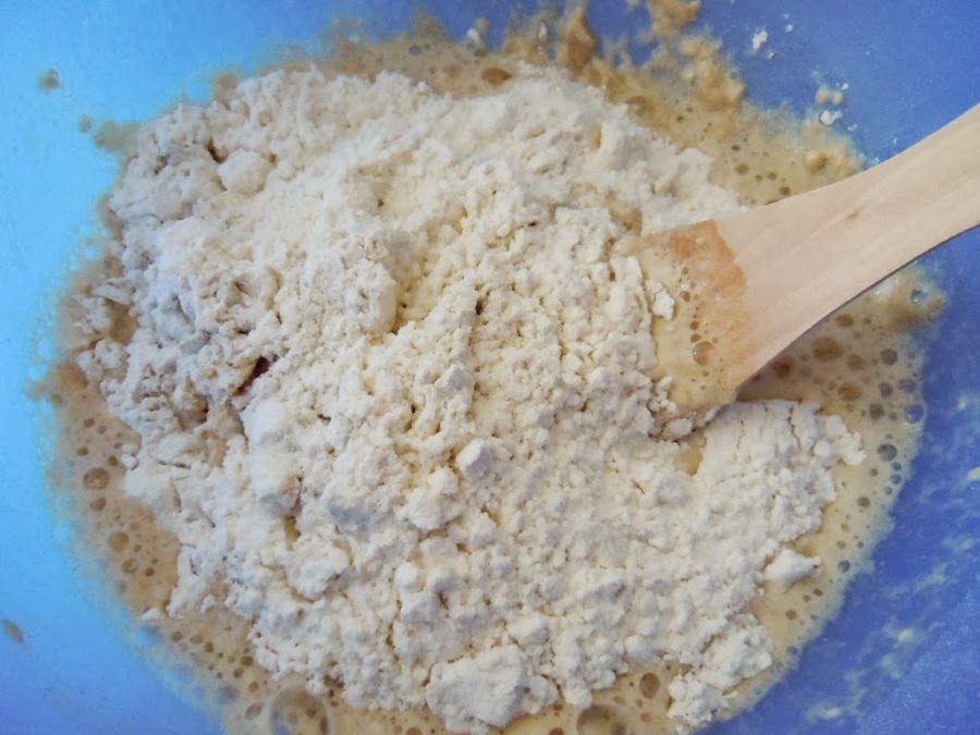 Añadimos las harinas tamizadas junto con la sal y removemos la mezcla hasta que nos quede de una textura elástica. No taréis que ya huele la mezcla a cerveza.