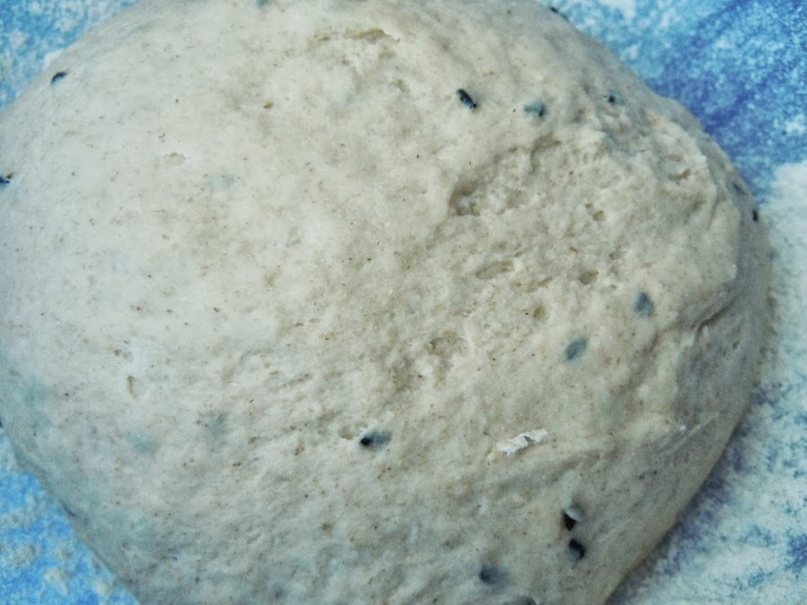 Enharinamos un molde pequeño de unos 22-24 cm de diámetro y vamos cogiendo las bolas de masa, las humedecemos por la parte de arriba con agua y la presionamos con fuerza en semillas al gusto. Las iremos colocando formando un trébol dentro del molde.