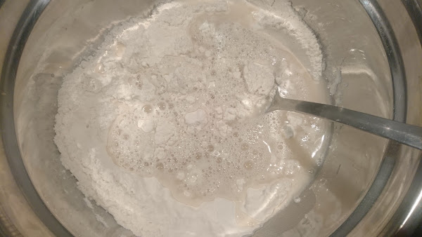 En un bol grande echamos la harina y la sal. Removemos para integrarlos. Acto seguido vertemos el agua con la levadura y volvemos a remover con energía, hasta que la harina se mezcle bien con el líquido y no queden grumos.