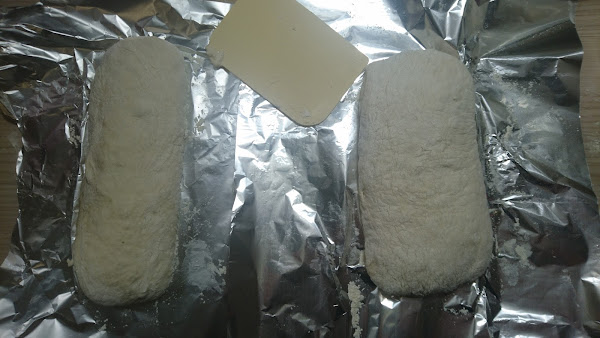 Damos ligeramente forma a los panes a modo de chapata, ligeramente rectangulares.