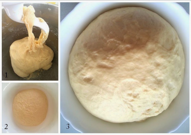 Untar un recipiente grande con mantequilla, poner la masa en este, cubrir con plástico y dejar levar hasta que duplique su volumen, de 1-2 horas, dependiendo de la temperatura ambiente.