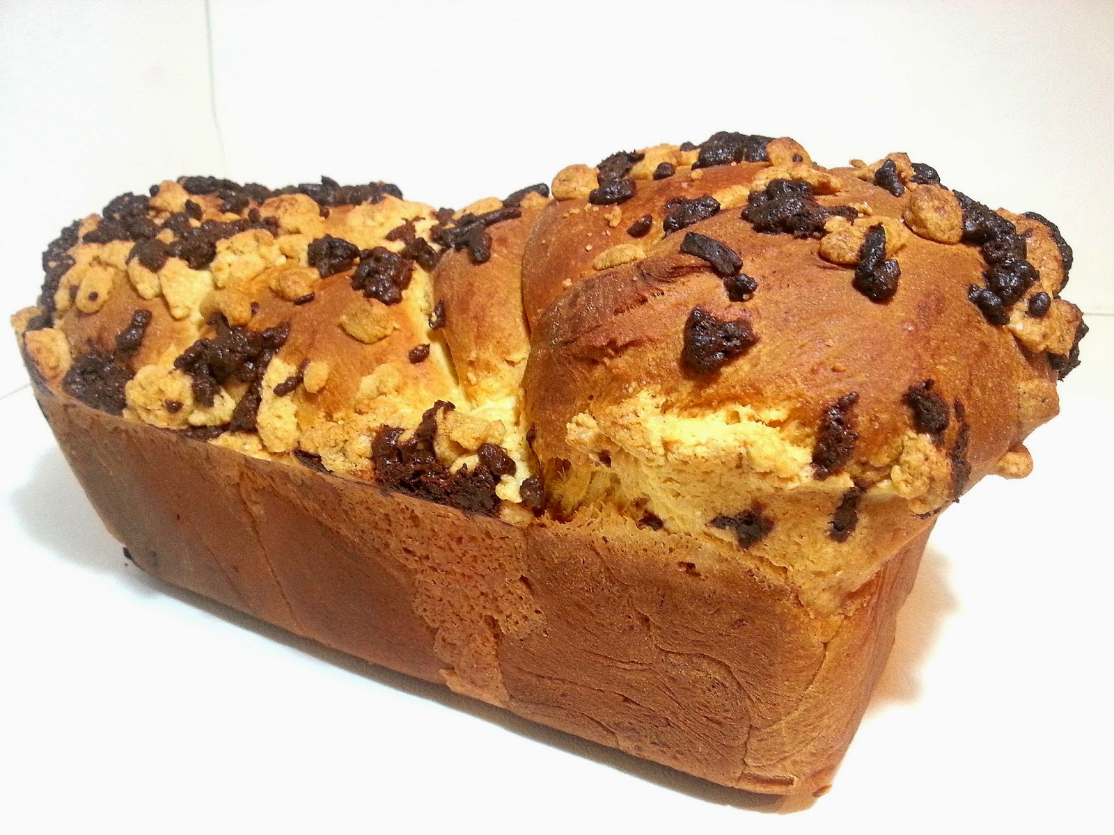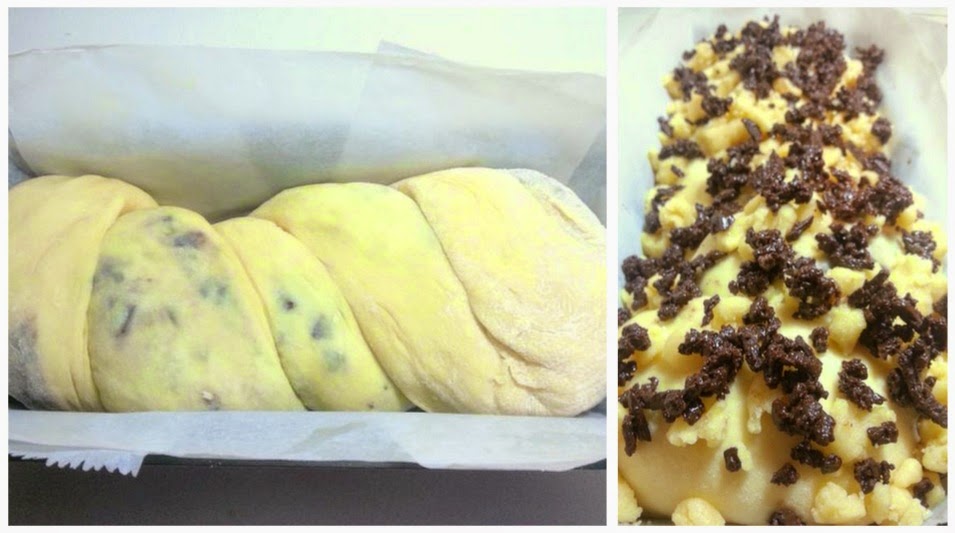 Poner sobre un molde para plum cake, estrechando la masa todo lo que sea necesario para que quepa en el molde, untar la superficie con huevo batido con la nata (crema de leche), regar por encima la parte de relleno que se reservo y el crumble que también teníamos reservado, cubrir con plástico transparente para cocina y dejar levar por 20 minutos aproximadamente.