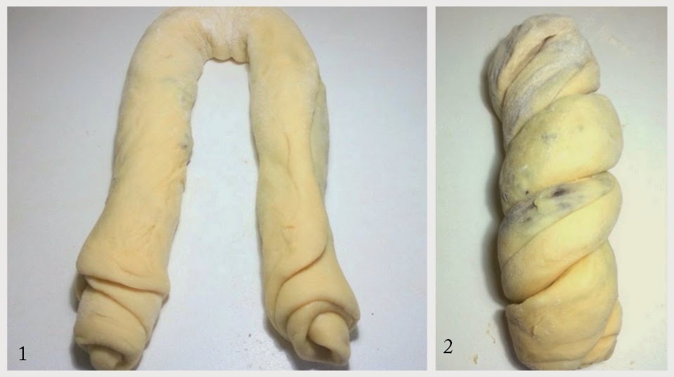 Enrollar la masa sobre la parte mas larga, cuando el rollo este hecho, hacer una U uniendo los dos extremos y juntando los dos largos, pasar uno por encima del otro haciendo una especie de trenza apretada.
