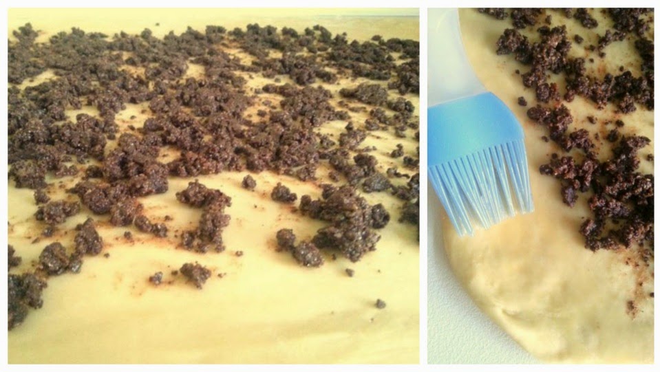 Cuando la masa haya duplicado su volumen, volcarla sobre una superficie lisa, limpia y con un poco de harina, dejarla reposar por 5 minutos y luego estirar con el rodillo y hacer un rectángulo de aproximadamente 45 cm x 60 cm, reservar 1/4 del relleno y el resto regarlo sobre el rectángulo distribuyendolo muy bien y dejando 3 cm aproximadamente de los bordes libres, pintar este borde con el huevo batido con leche.