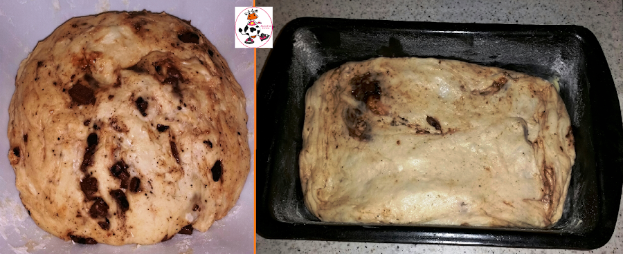 Una vez amasada, 5 a 10 minutos, añadimos el chocolate,una cucharadita de canela y otra de jengibre. Seguimos amasando otros 5 minutos y dejamos reposar hasta que fermente.