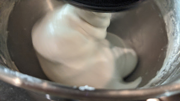 Está preparada para admitir más agua. Dejo en velocidad 2 y añado 10 g de agua. Sigo en esa velocidad y añado los otros 10 g de agua. Cómo veo que se despega la masa del bol voy incorporando el aceite, despacio y sin parar la máquina
