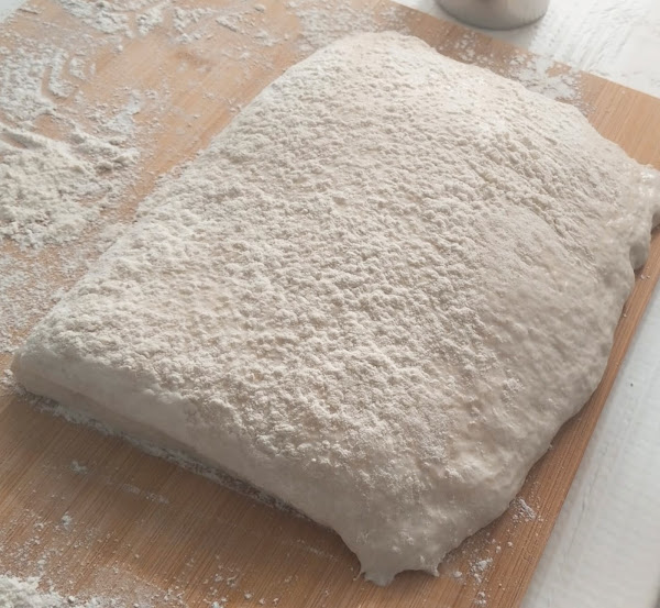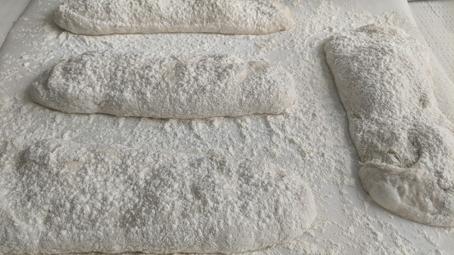Vuelco sobre mi tabla de trabajo, muy enharinada, y hago porciones que paso al papel de horno, también muy enharinado