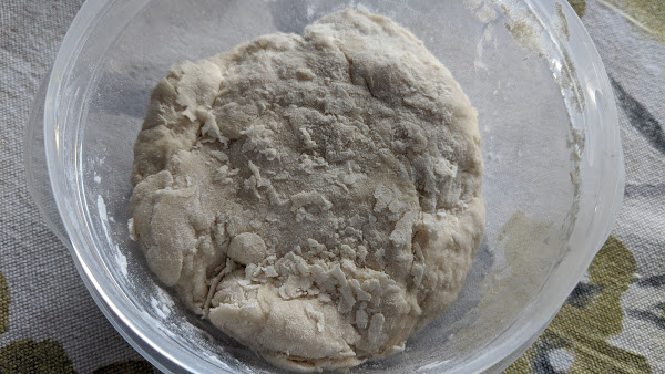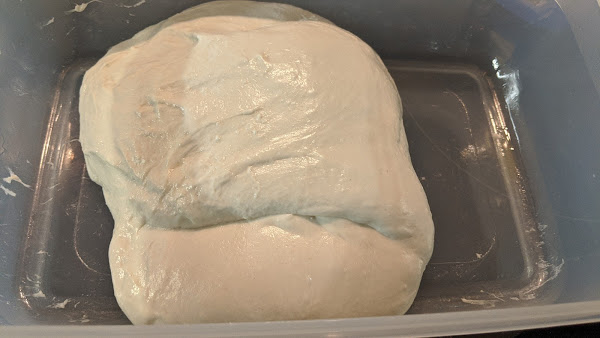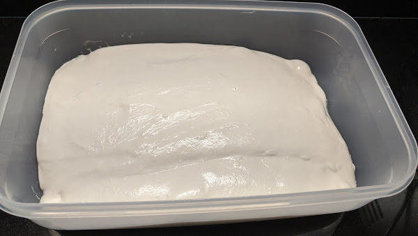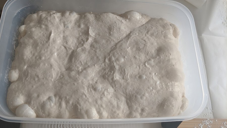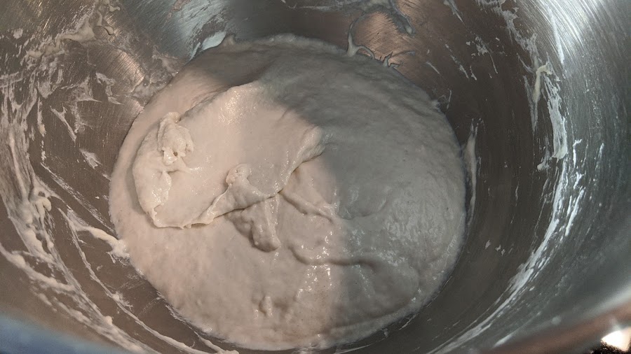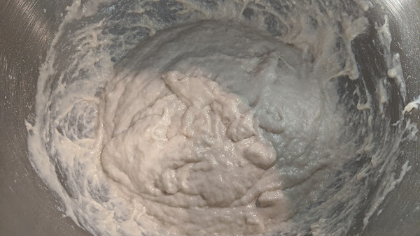 0,5 g de levadura secaYo amaso muy ligeramente los ingredientes para integrarlos. Dejo que empiece a subir y lo meto a la nevera un mínimo de 30 horas