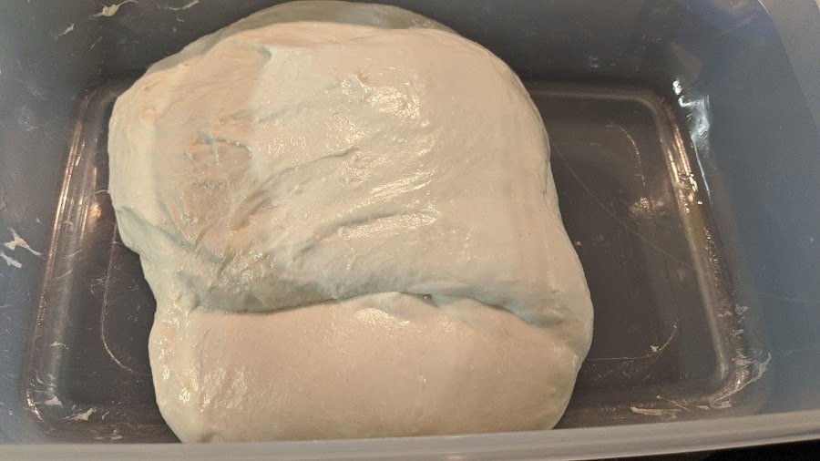 Pasada una hora hago un pliegue. Dejo que continúe el levado y antes de que doble (como un 65% aproximadamente) pliego de nuevo y meto en la nevera toda la noche