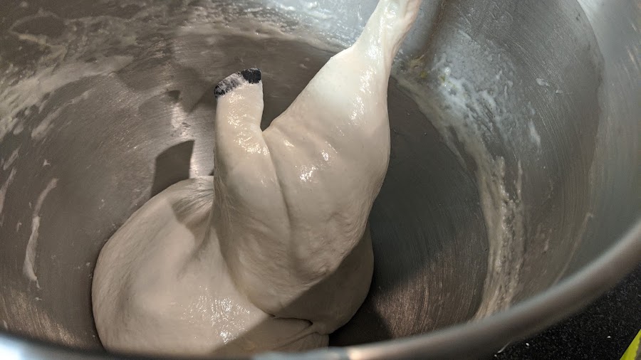 La masa no se calienta apenas y va desarrollando el gluten poco a poco. Vuelvo a amasar a velocidad 2 y la masa se despega del bol