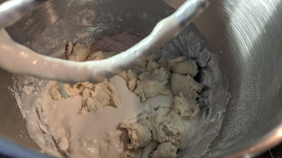 Añadimos la biga desmenuzada, la sal y la levadura y amasamos con la pala hasta que quede la mezcla integrada. Cambiamos y ponemos el gancho