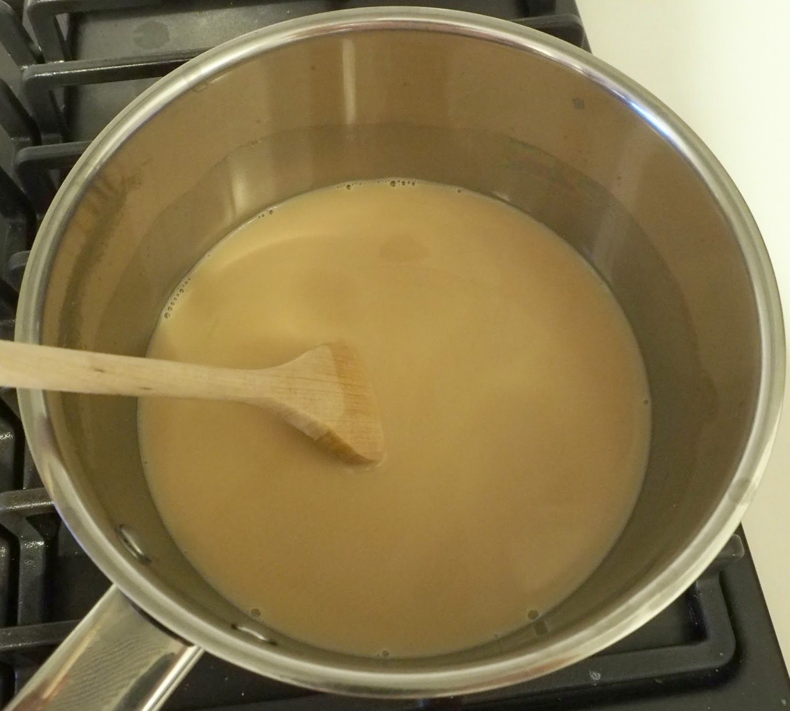 - Ponemos el horno a calentar a 160ºC y mientras calentamos en una cazuela la leche, con el azúcar y la miel, removiendo hasta que quede un líquido homogéneo.