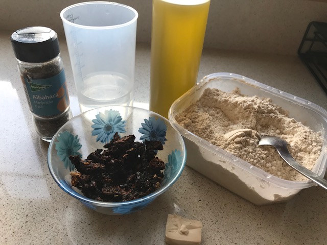 En este momento añadimos los tomates secos picados y la albahaca seca, hasta que quede todo bien mezclado. Tapar con un paño y film y dejar al menos una hora hasta que doble su volumen.