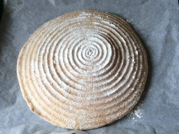 Después, volver a amasarlo un poco y formar una bola. Colocar sobre papel de horno en la bandeja y dejar levar tapado por un paño. En mi caso, para darle forma lo he metido en una cesta que utilizo de frutero. Lo he cubierto por un paño y lo he dejado levar una hora.