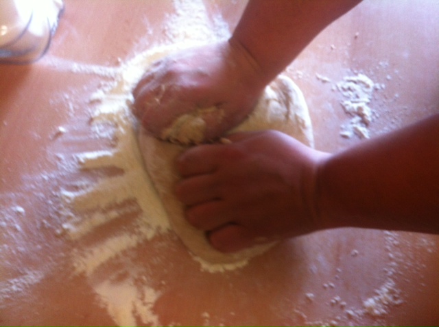 Cuando se haya formado una mezcla homogénea, echar en la encimera limpia un poco de harina y empezar a amasar 10-15 minutos con las mano.
