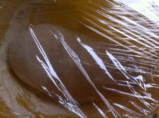 Una vez amasado, volver a poner en el bol (dejo el bol "sucio" con la harina de antes para que no se pegue), tapar con film y dejar en un sitio donde no haya corrientes durante 45 minutos, hasta que aumente en volumen.