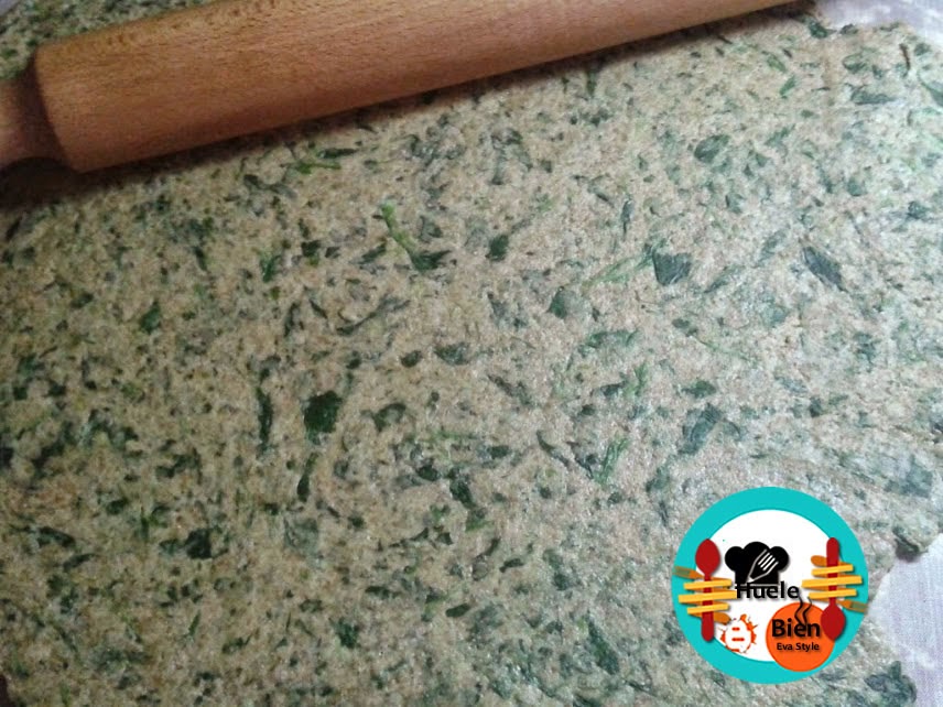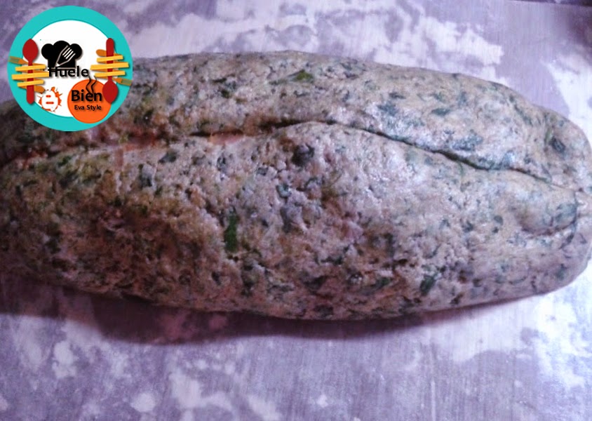 2.- En un bol mezclamos la harina con el resto de los ingredientes para la masa. Añadimos 5 cucharadas de agua fría y las espinacas. Lo amasamos todo con la batidora ( amasadora) durante 5 minutos a velocidad mínima y después otros 5 minutos a velocidad máxima. Hasta obtener una masa homogénea.