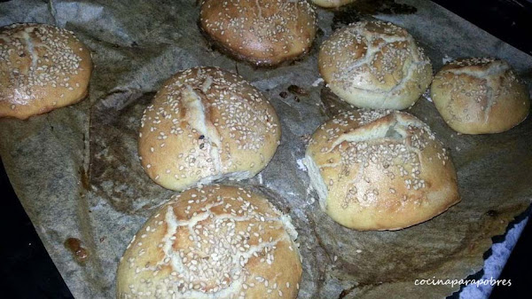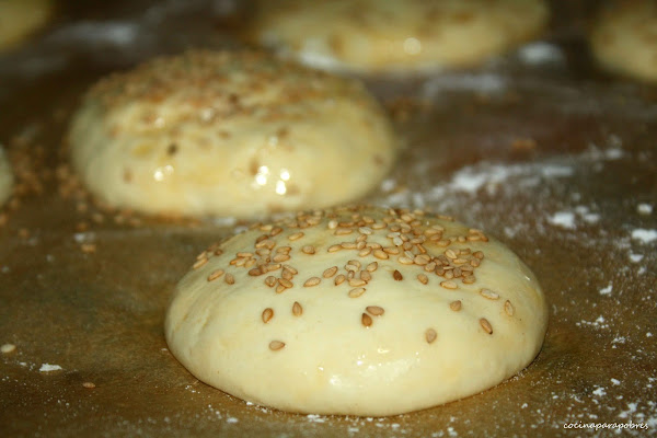 Damos forma a los panecillos y colocamos sobre la bandeja del horno que previamente hemos forrado con papel de hornear, pintamos con huevo batido y esparcimos semillas de sésamo sobre los panecillos. Dejamos reposar 1/2 hora.